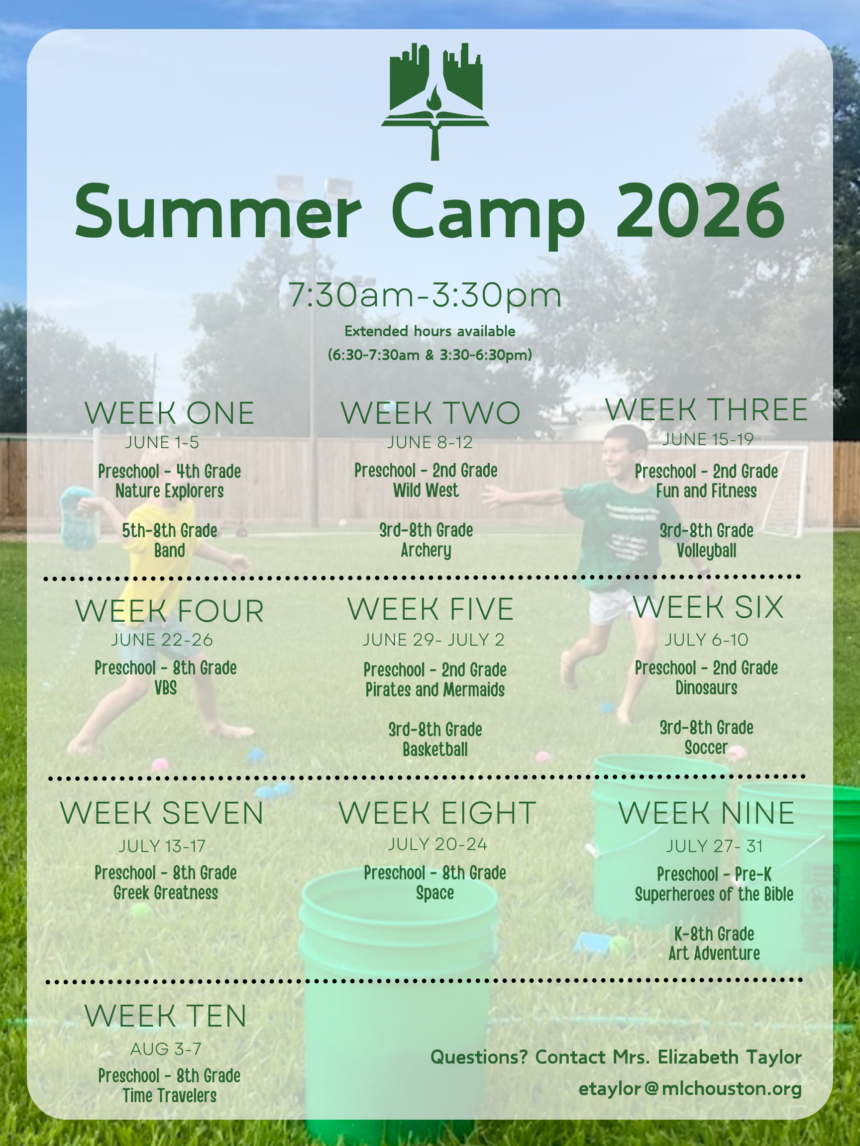 Cost per week vary from $325-400 depending on activities. The week of July 29-July 2 is priced at $260 as camp this week runs for 4 days. The hours covered by the weekly fee are 7:30 am - 3:30 pm. Extended Care hours are available for a fee and can be purchased during registration. Members of Memorial Lutheran Church can receive a 20% discount when registering for Summer Camp prior to March 2nd.